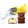 Конфеты Тими сливки-банан от Конти Рус завернуты в бело-желтую обертку с надписью бренда. Нежное суфле в форме мишки глазировано в шоколадом. Вкус — сливки с бананом.