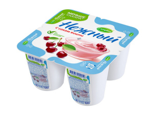 Состав - обезжиренное молоко, сливки, вода, сахар, глюкозно-фруктозный сироп, загуститель модифицированный крахмал, сухая молочная сыворотка, фруктовый наполнитель (концентрированный сок вишни, вода, ароматизатор "вишня" идентичный натуральному, краситель -кармин, фруктовые и растительные экстракты, регулятор кислотности - цитрат натрия), загуститель - пищевой желатин, лактоза, с использованием закваски