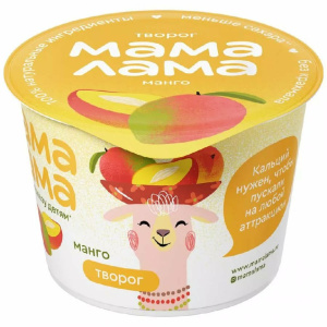 Творог «Мама Лама» с манго. Продукт предназначен для питания детей дошкольного и школьного возраста (для детей старше 3-х лет). Массовая доля жира 3,8 %.