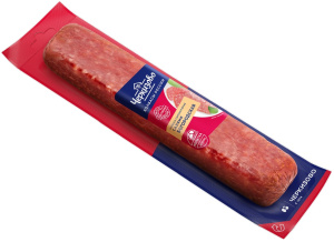 Филе куриное, шпик, вода, свинина, соевый белок, соль, натуральные специи и их экстракты (кардамон, мускатный орех, перец, чеснок, тмин), мальтодекстрин, виноградный сахар, усилитель вкуса и аромата (глутамат натрия 1-замещенный), антиокислители (аскорбиновая кислота, аскорбат натрия), ароматизатор, сироп глюкозы, красители (красный рисовый, кармины), стартовая культура, фиксатор окраски-нитрит натрия.