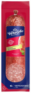 Свинина, шпик, вода, соевый белок, соль нитритная (соль, фиксатор окраски-нитрит натрия), декстроза, ароматизаторы, усилитель вкуса и аромата (глутамат натрия 1-замещенный), специи и их экстракты, антиокислители (изоаскорбат натрия, экстракт розмарина, аскорбиновая кислота), лук, мальтодекстрин, краситель (кармины), стартовая культура.