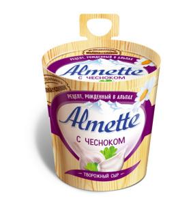Творожный сыр «Альметте» с соблазнительной пикантной ноткой чеснока. Популярен в качестве сливочного сыра для бутербродов, сандвичей и ржаных гренок. Сыр «Альметте» с чесноком также может быть использован как дополнение к горячим блюдам — пару ложек в суп, жаркое, соус для запеканки — и блюдо приобретает аппетитный чесночно-сливочный аромат.